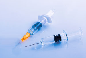 Closeup of two syringes beside a vial of vaccine for flu, COVID-19, measles or other diseases