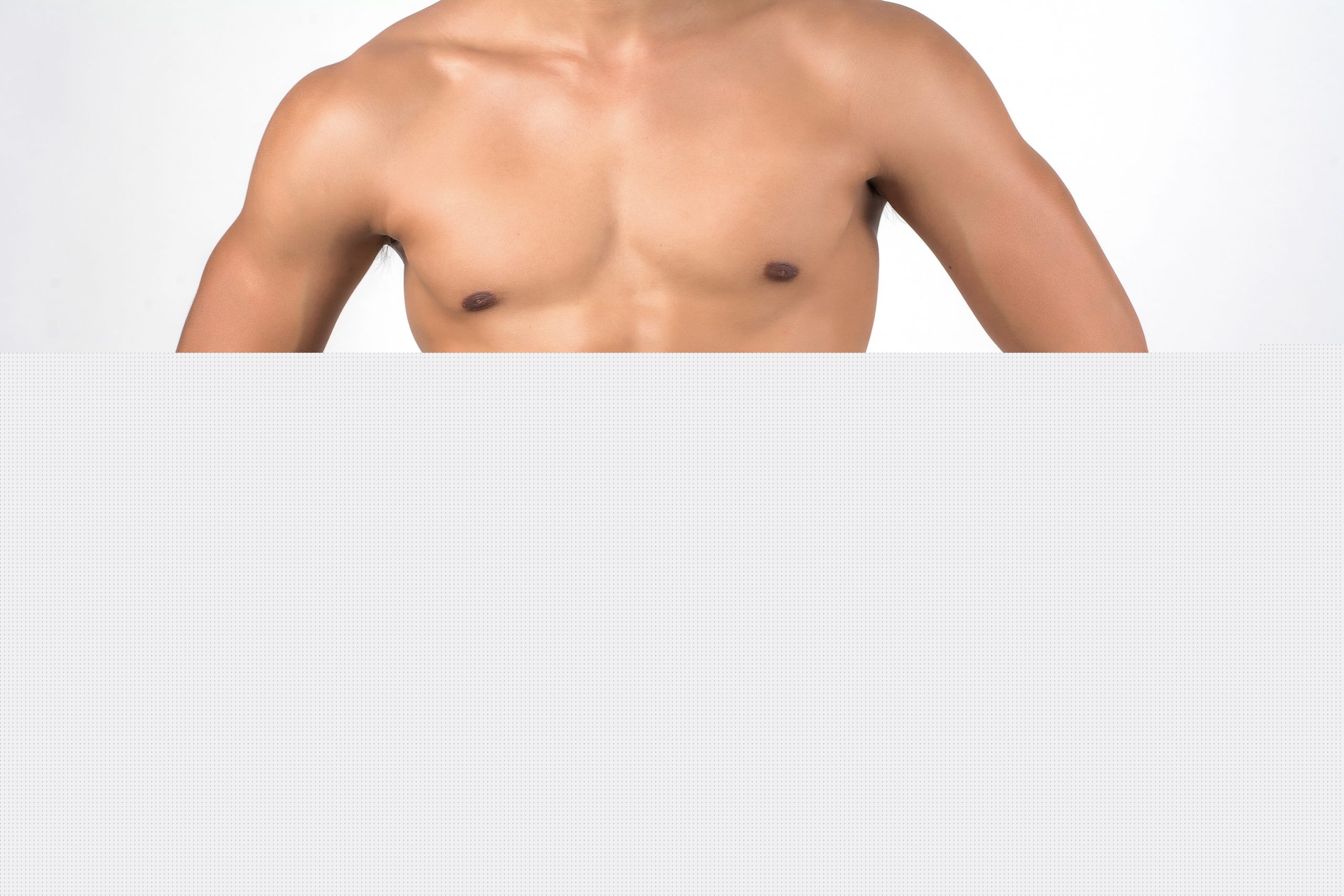 Muscular man showing six pack abs isolated on white background.